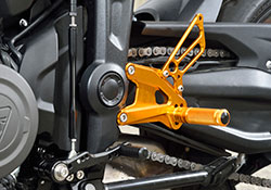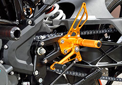 SATO RACING Rear Sets for 2024+ KTM 390 Duke features a track-optimized design, with precision-machined billet aluminum components and 6 adjustable foot peg positions. Choice of Black or Gold anodized finish.