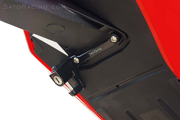 for Aprilia RS4 125. Tough steel lock with a black anodized billet aluminum mounting bracket and stainless steel bolts. Installs in a convenient location under the tail section. Includes 2 keys. A matching Helmet Anchor is an available option. |