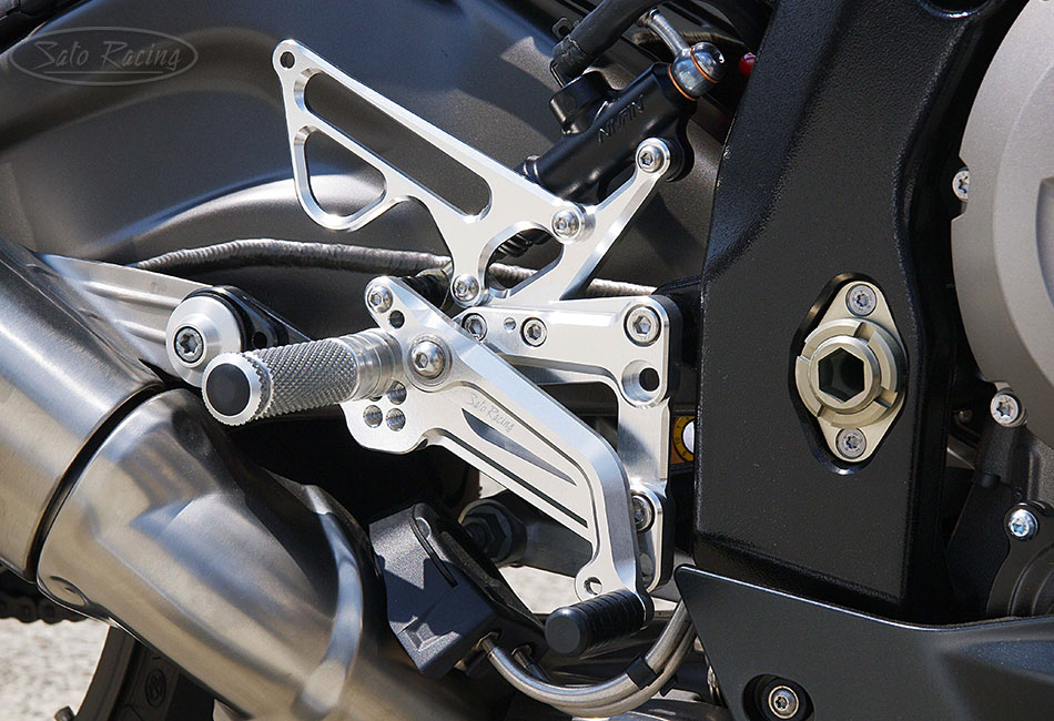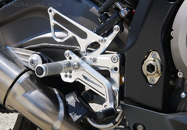 | SATO RACING 'Version 2' design Rear Sets for 2009-2014 S1000RR and HP4 feature components made of light-weight high strength billet aluminum anodized in your choice of Black, Silver or Gold. These "Forward/Up"-type Rear Sets have a one-piece step plate design that provides a higher and more forward range of foot peg positions compared to our original S1000RR Rear Sets. As with that model, this model can be set up for stock shift pattern or reverse shift pattern. We offer a kit compatible with the early non-ABS version of S1000RR, in addition to the ABS-equipped models. |