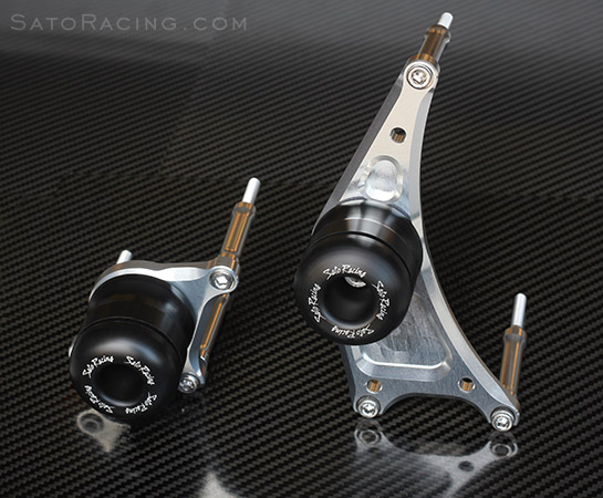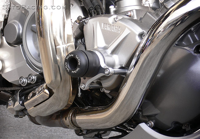 | SATO RACING Engine Sliders for Yamaha MT-01 (all years) feature slider pucks made of high density, abrasion-resistant black DELRIN for excellent protection of the lower engine area and exhaust parts if the bike slides on the track. The slider pucks are attached to the engine case with anodized billet aluminum brackets and collars, and stainless steel bolts. (L/R Set of 2) |