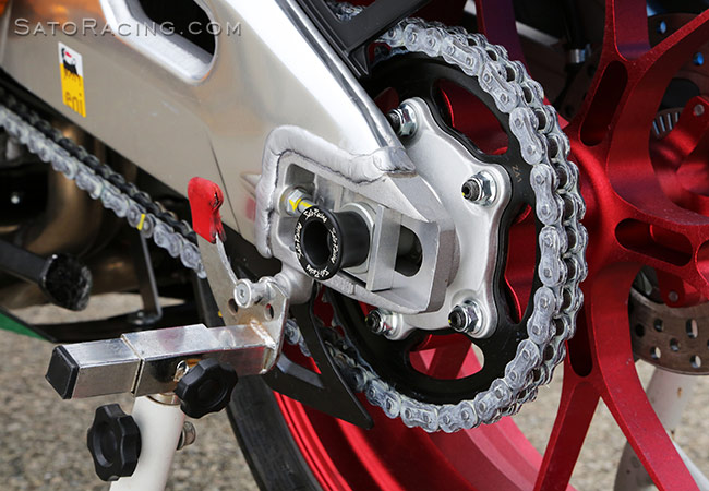 | SATO RACING Race Concept Rear Axle Sliders* for 2016 and up Aprilia RSV4 and Tuono V4 1100 were developed for SST class endurance racing and the Suzuka 8 Hours endurance race. These unique lightweight sliders have a convenient push-in design. Made of high density, abrasion-resistant black Delrin plastic, they will reliably protect of the rear wheel hub and swingarm from scrapes or more serious damage if you lay it down at speed. NOTE: Installation requires flipping the rear wheel spindle and chain guide plate hardware left to right so the open end is on the left side and the nut is on the right side, as shown in the photos below. * Our 'Race Concept' series of parts are specialized racing parts meant for track use only and are not designed for or intended for street use. |
